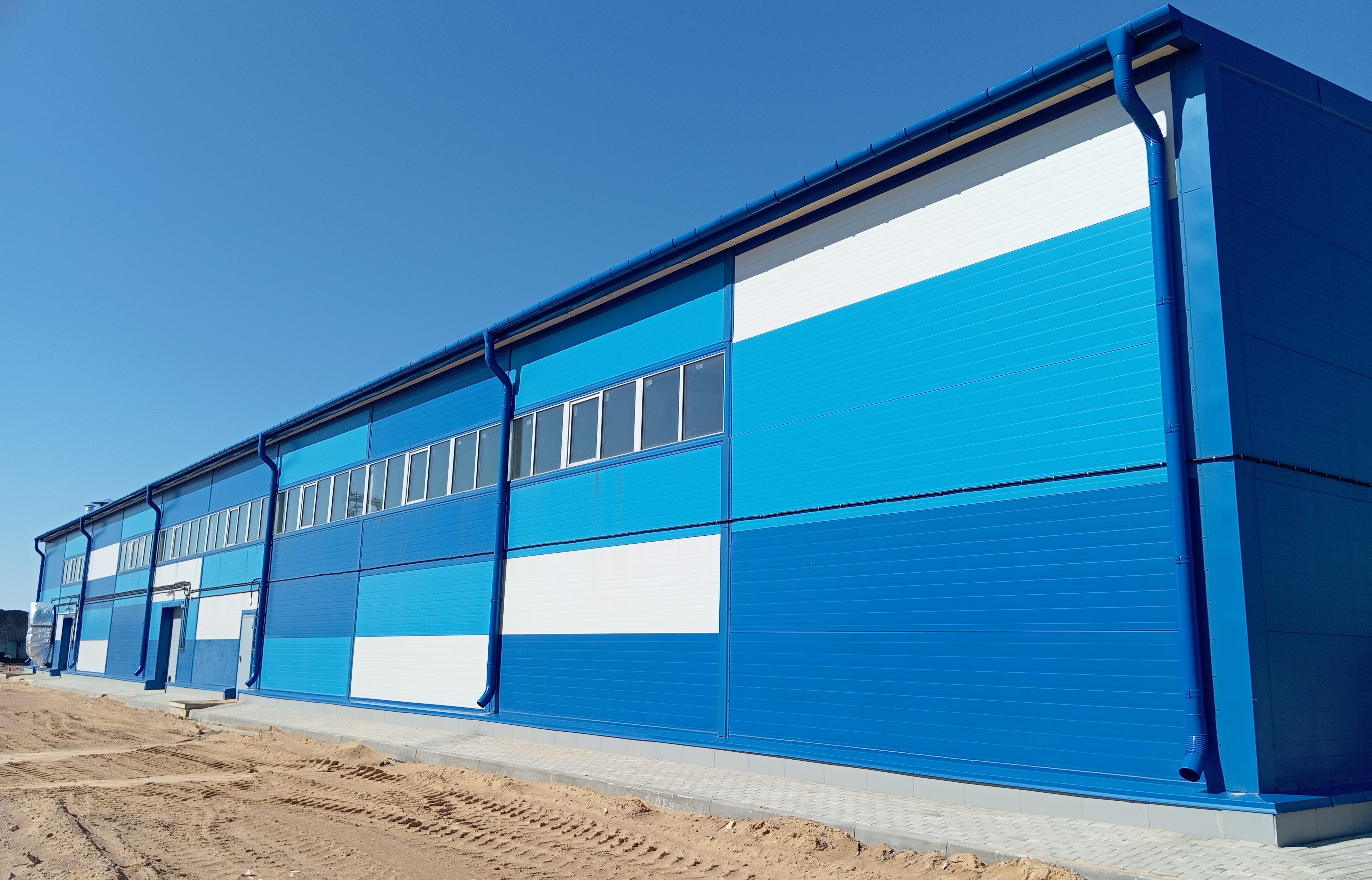 - наружные стены выполнены из сэндвич-панелей 150 мм RAL 5005/1015, 5015/1015, 7047/1015;