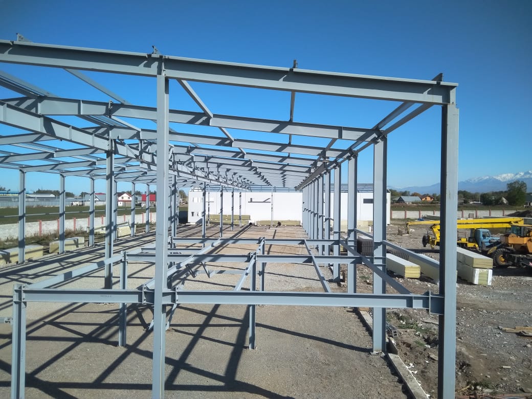 Из элементов заводского изготовления, соединяемых между собой болтами. Колонны устанавливаются на анкерные болты в фундаменте.
