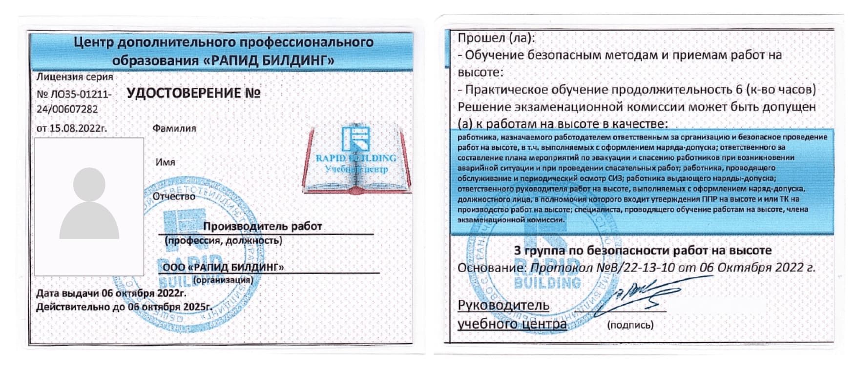 Документ, разрешающий вам высотные работы, сроком на 3 и 5 лет.