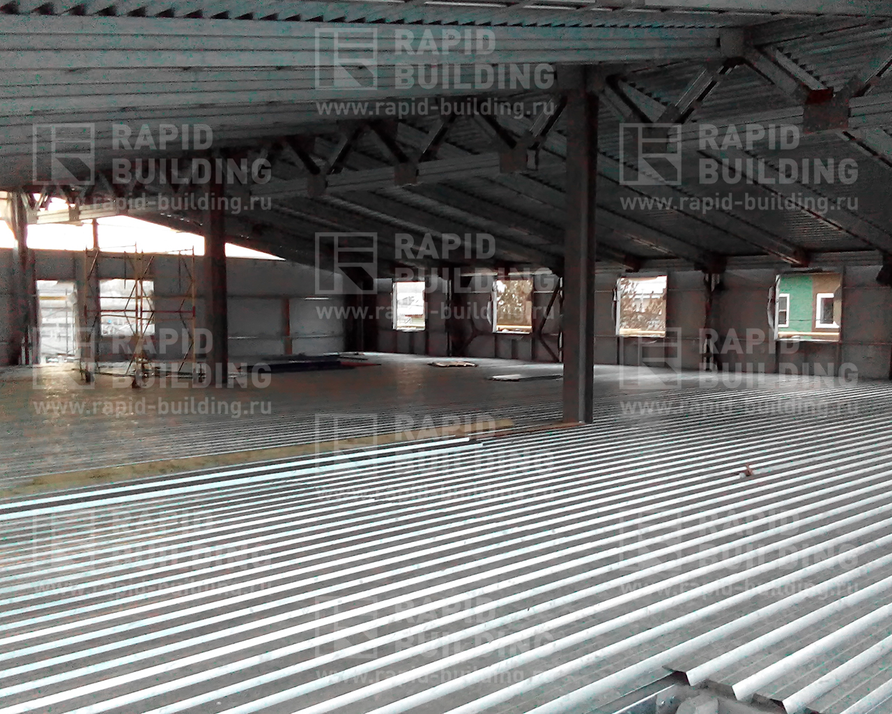Каркас здания сборный из облегченного холодногнутого оцинкованного профиля. Пролет межэтажного перекрытия 11 метров.